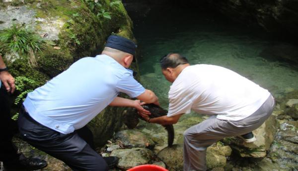 7月10下午13時許,四川省萬源市大竹河派出所聯合大竹鎮人民政府前往萬源市花萼山國家級自然保護區管護站,將一條重達約4.2公斤的野生“娃娃魚”放生大自然。