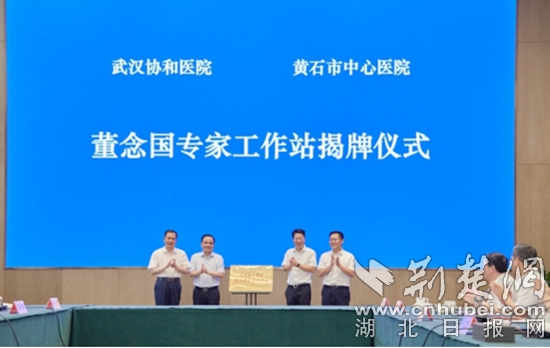 武漢協和醫院黨委書記張玉,協和醫院董念國教授,黃石市委常委、市委組織部部長廖進軍,市政協副主席、市衛健委主任郭雙喜共同為工作站揭牌。副市長李麗主持揭牌儀式。