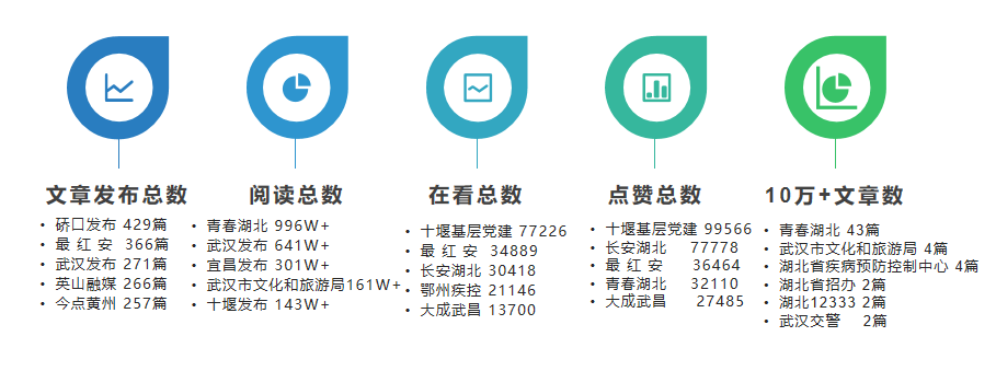 從單項(xiàng)指數(shù)看,文章發(fā)布總數(shù)、閱讀總數(shù)、點(diǎn)贊總數(shù)等指數(shù)有出現(xiàn)小幅波動(dòng)。在TOP100榜單中,五成賬號(hào)文章發(fā)布數(shù)量上升,有13個(gè)賬號(hào)發(fā)文超200篇,分別為“武漢發(fā)布”“宜昌發(fā)布”“最紅安”“硚口發(fā)布”“黃石發(fā)布”“荊州發(fā)布”“蘄春網(wǎng)”“天門發(fā)布”“湖北福彩”“麻城發(fā)布”“今點(diǎn)黃州”“英山融媒”“新江陵”;近六成賬號(hào)文章閱讀總數(shù)上升,有13個(gè)賬號(hào)閱讀總量過(guò)100萬(wàn)次,其中“青春湖北”“武漢發(fā)布”“宜昌發(fā)布”“武漢市文化和旅游局”“十堰發(fā)布”優(yōu)勢(shì)明顯,依次為996W+、641W+、301W+、161W+、143W+。