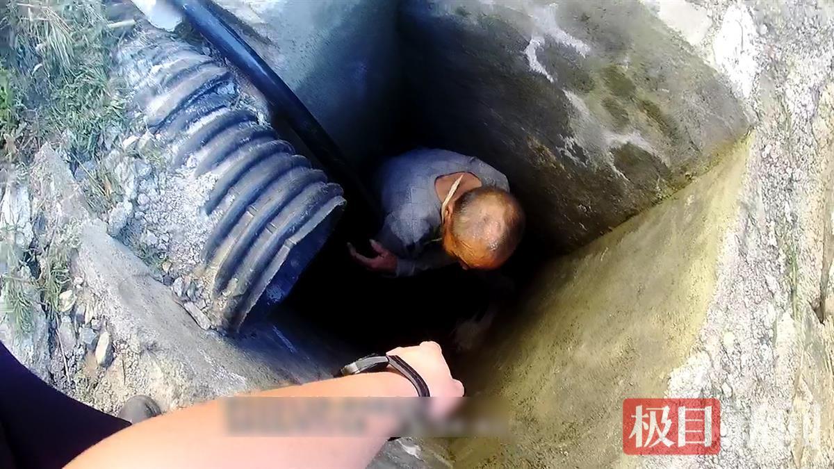 此時,老人拼盡力氣直起身來,民警趴在井口,探下身子緊緊抓住老人手臂,發力將老人成功拉了上來。