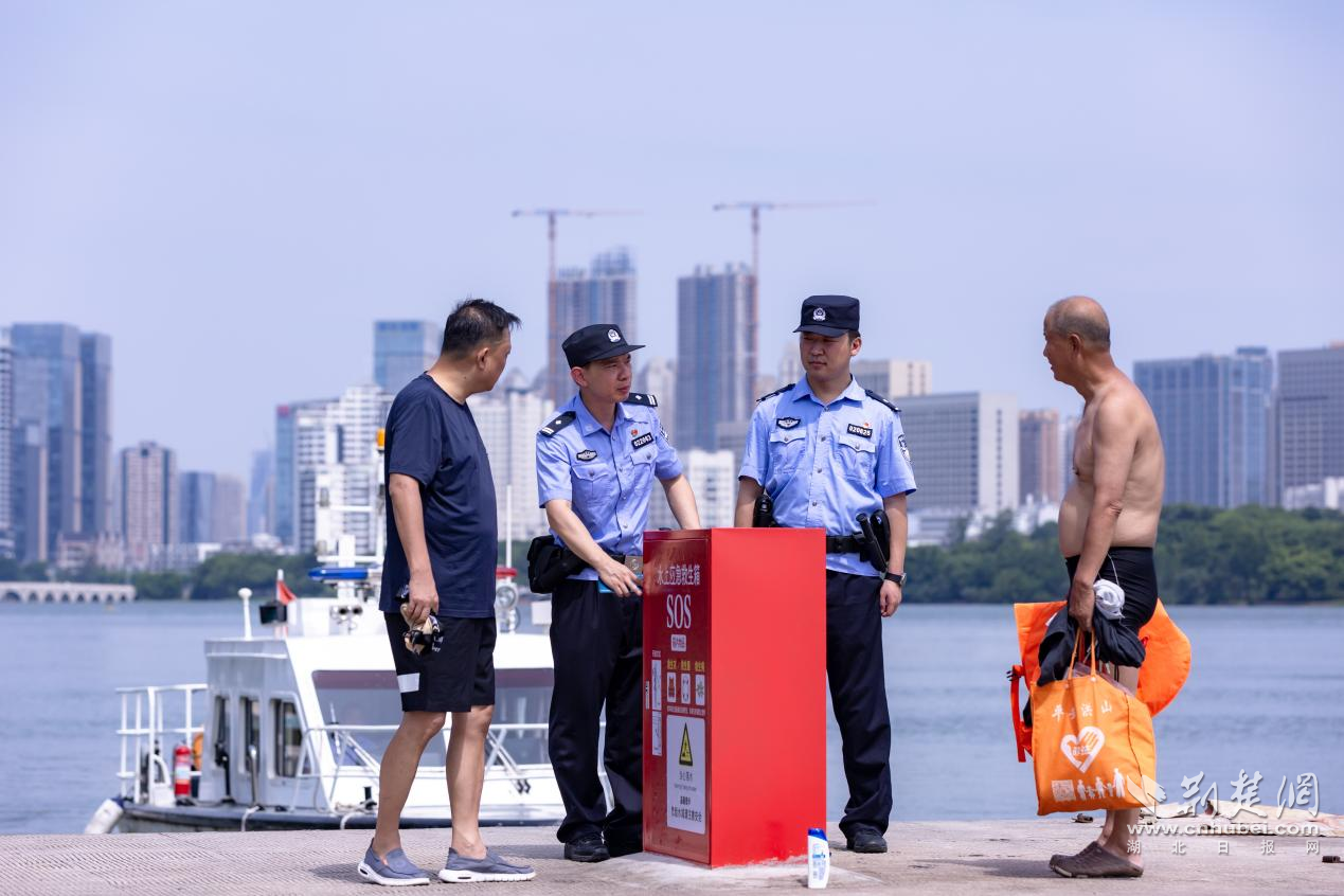東湖民警在凌波門勸阻戲水群眾。蘇暢 攝