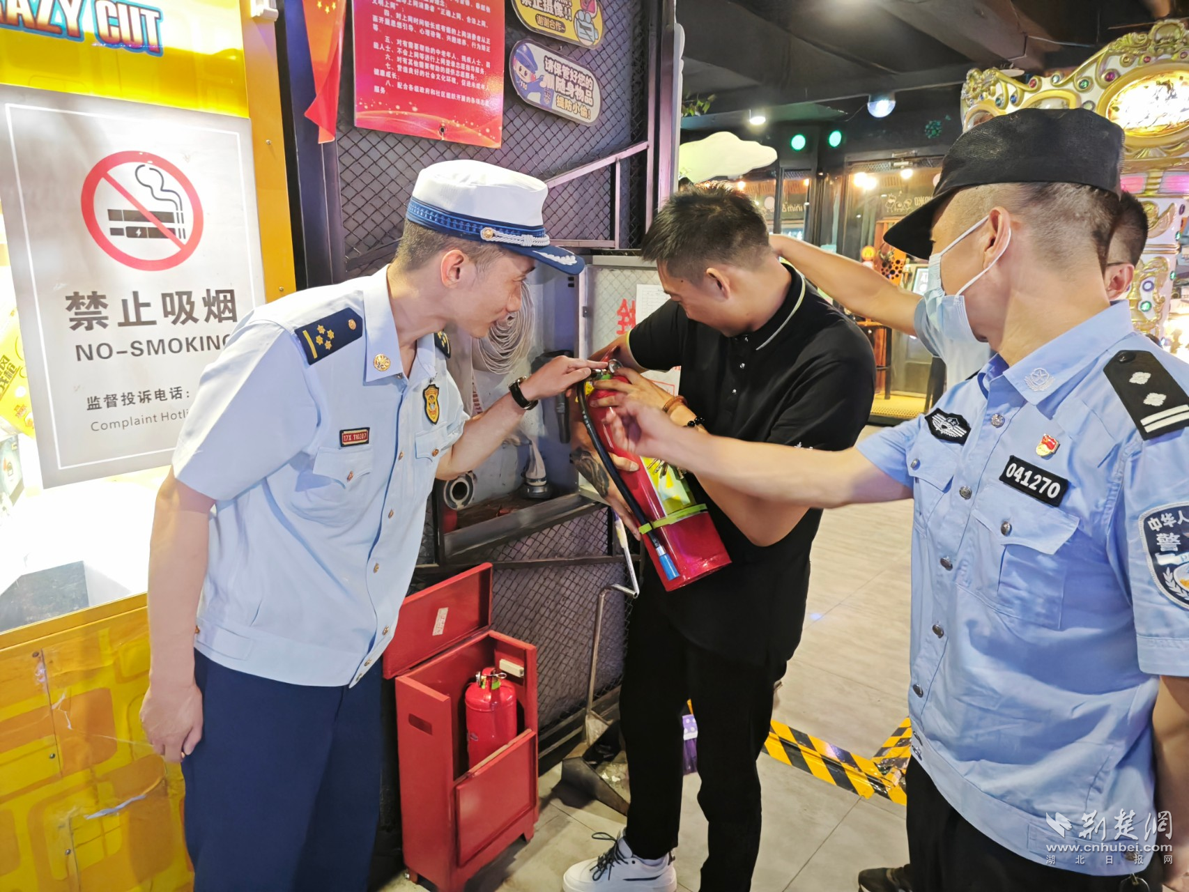 7月12日晚,武漢市公安局治安管理局聯合市消防救援支隊對全市公共娛樂場所開展消防安全夜查行動。由公安派出所、消防救援大隊、街道、社區組成的聯合檢查組對公共娛樂場所的安全出口、疏散通道、消防設施、消防值守等情況進行了檢查。