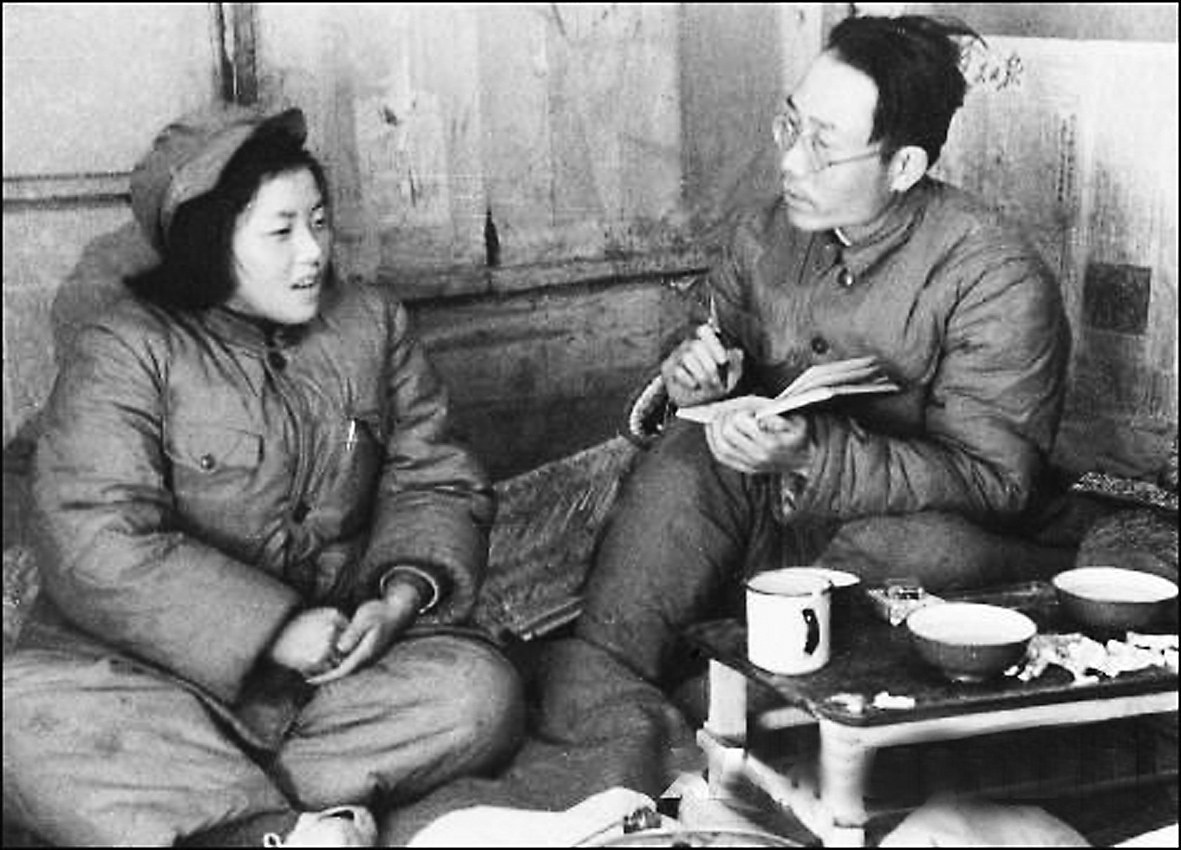 1952年,魏巍(右)在朝鮮三登野戰(zhàn)醫(yī)院采訪志愿軍模范護(hù)士羅克賢。