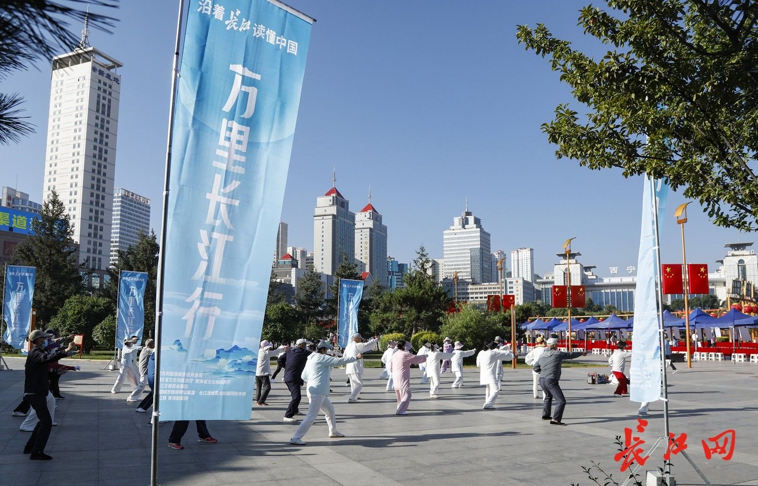 7月21日上午,“沿著長江讀懂中國——萬里長江行”主題宣傳推廣活動青海段探訪啟動儀式在西寧市中心廣場舉行。圖為活動前西寧市民在晨練。王箏 攝