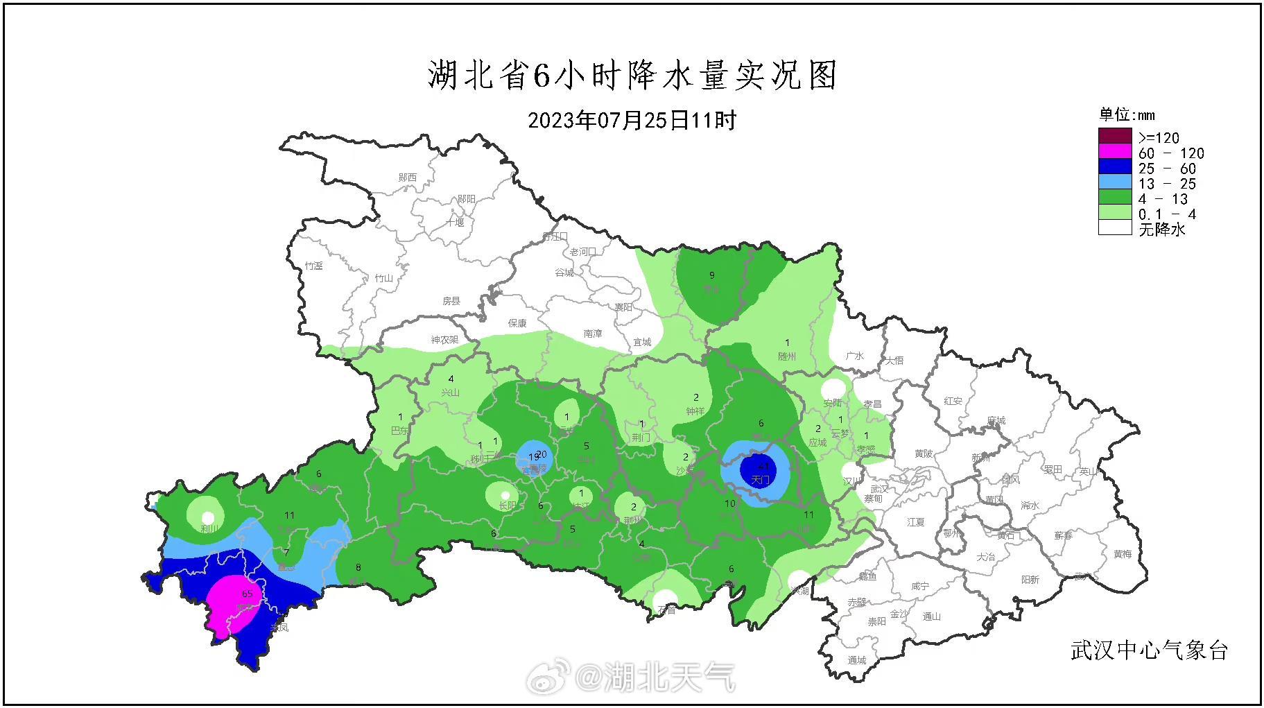 記者從湖北省氣象部門獲悉,截至今天(25日)11時,湖北中西部普遍降水,過去6小時里,恩施來鳳、咸豐降水量已超50毫米,發生崩塌、滑坡、泥石流風險大。據氣象預報,今明兩天受高空波動和偏東氣流影響,湖北省西部將有對流性降雨發生,較強降雨中心主要位于恩施、宜昌、神農架、十堰、襄陽等地,累計雨量一般30~50毫米,局部可達80~150毫米。