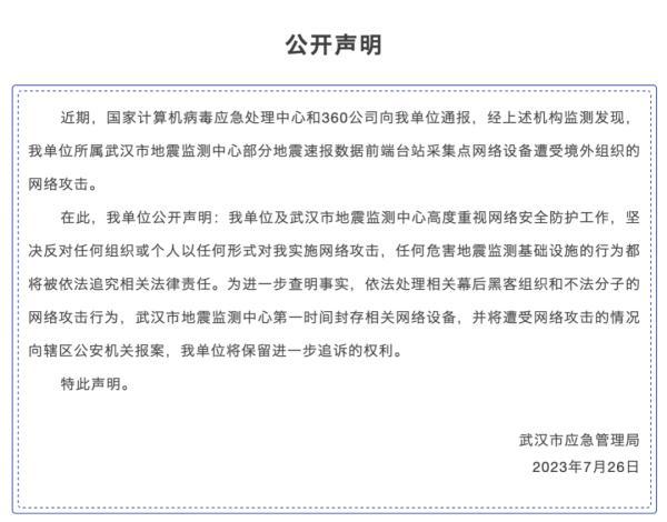 人民網北京7月26日電(記者梁秋坪、郝萍)7月26日上午,武漢市應急管理局發布公開聲明稱,武漢市地震監測中心部分地震速報數據前端臺站采集點網絡設備遭受境外組織的網絡攻擊。對此,武漢警方通報,已立案偵查,初步判定為境外具有政府背景的黑客組織和不法分子發起的網絡攻擊行為。