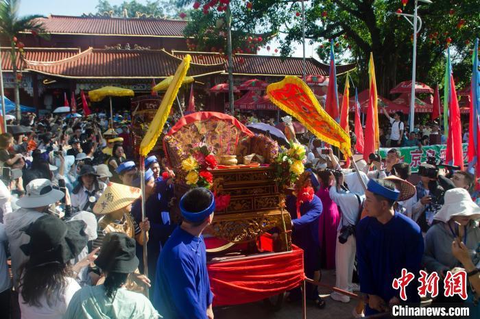 中新社防城港7月26日電 (翟李強 譚海東)來自中國和越南的邊民和游客26日歡聚廣西防城港市下轄的東興江平鎮尾島,共慶京族一年一度最盛大的傳統節日“哈節”。