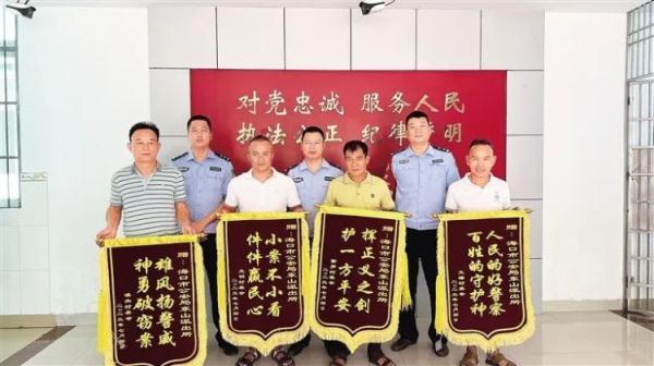 “你們一直把我們的事放在心上,不僅辦案效率高,還為我們挽回了損失,太感謝你們的幫助和付出!”近日,在海口市公安局秀英分局東山派出所門前,東山鎮紫羅村等4個村委會的村干部來到派出所,將4面錦旗送到民警手上,對民警偵破系列盜竊家禽案,為群眾挽回經濟損失表示感謝。