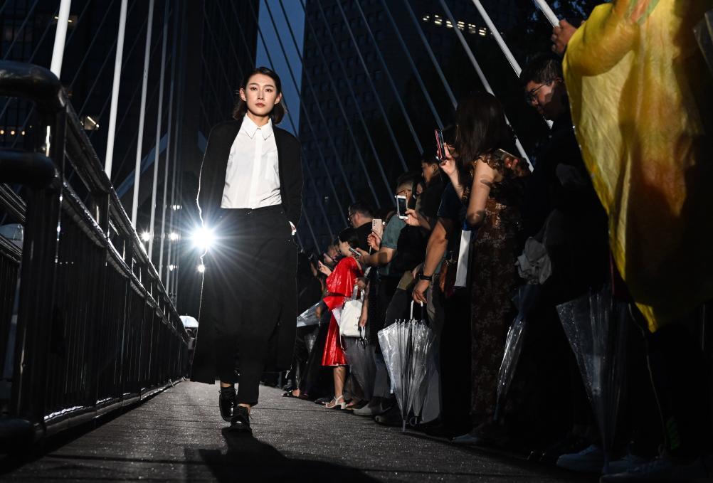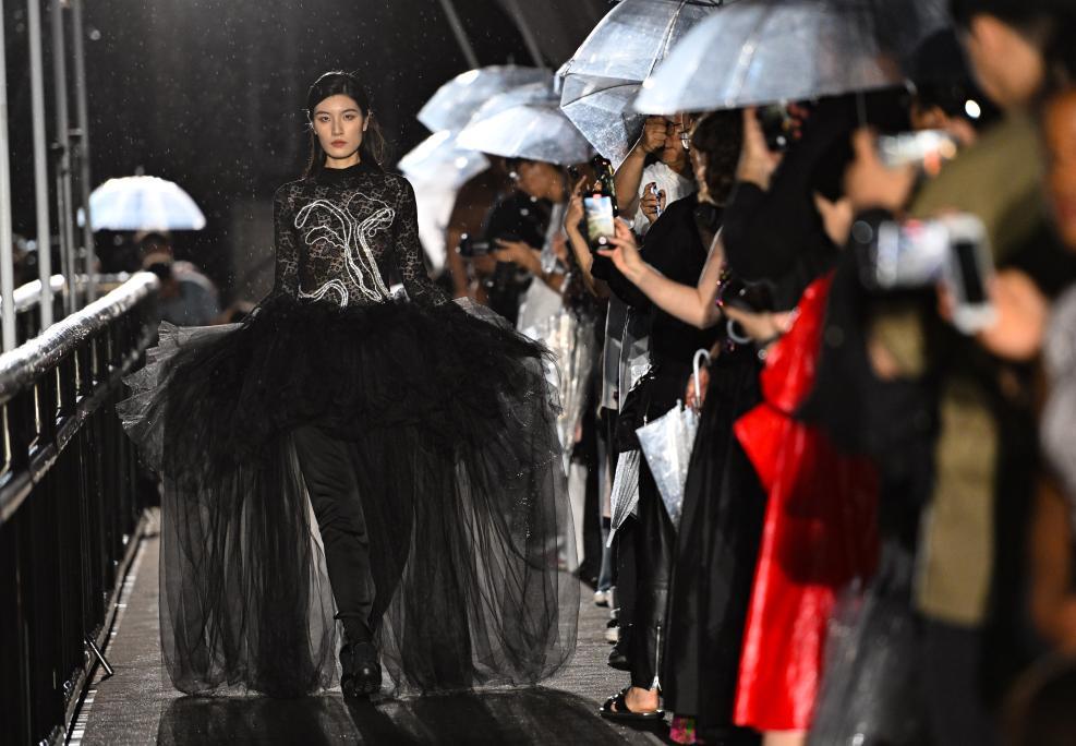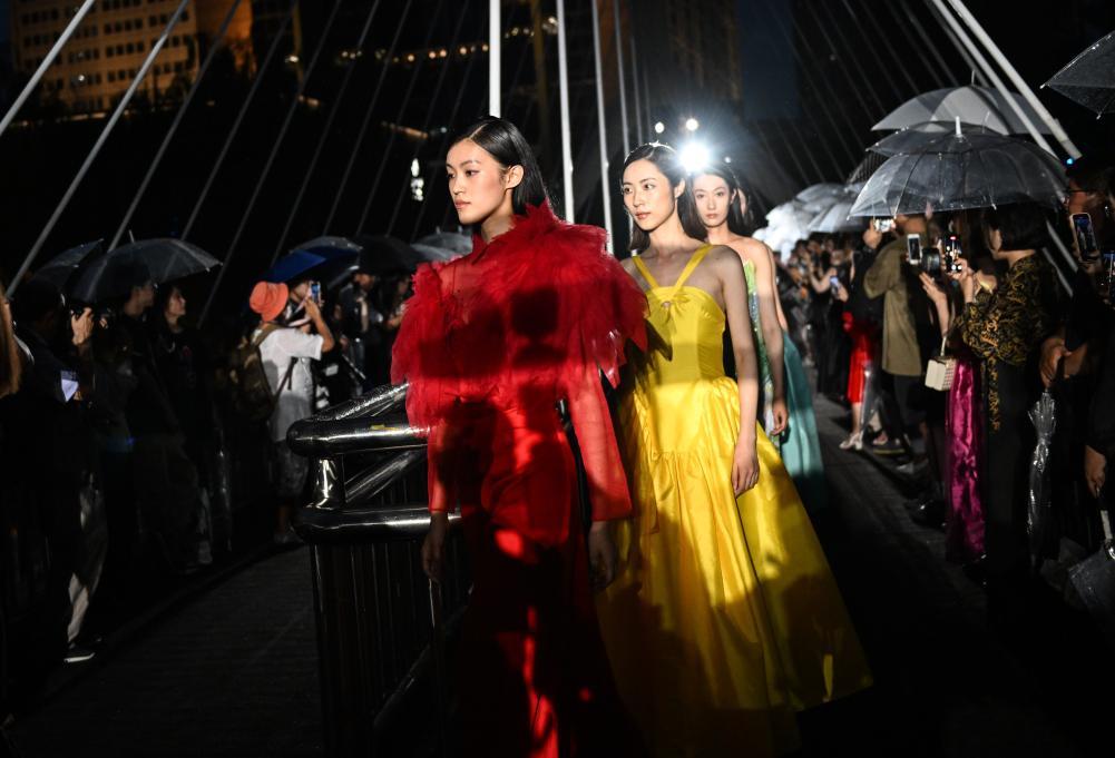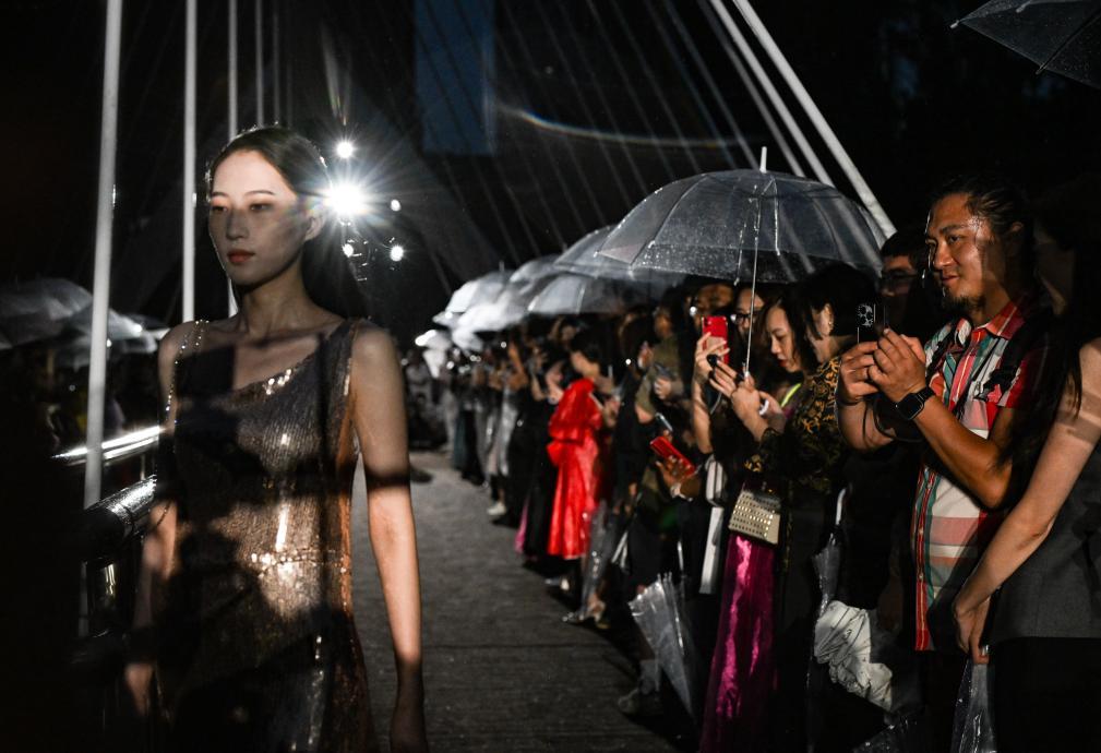 7月27日,觀眾在亮馬河友誼橋上觀看時裝秀。 當(dāng)日,在北京亮馬河友誼橋上,一場名為“型走亮馬河”的國際時裝秀在雨夜中上演。