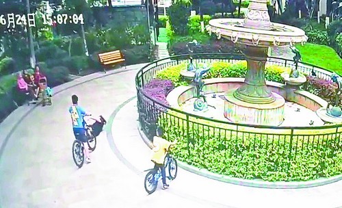 從黃女士發來的小區公共視頻可以看到:6月24日下午3點多,小區噴泉附近,一個男孩騎自行車出現在畫面中。其間,男孩轉頭向右側張望,結果,撞倒了正在左側行走的婆婆。