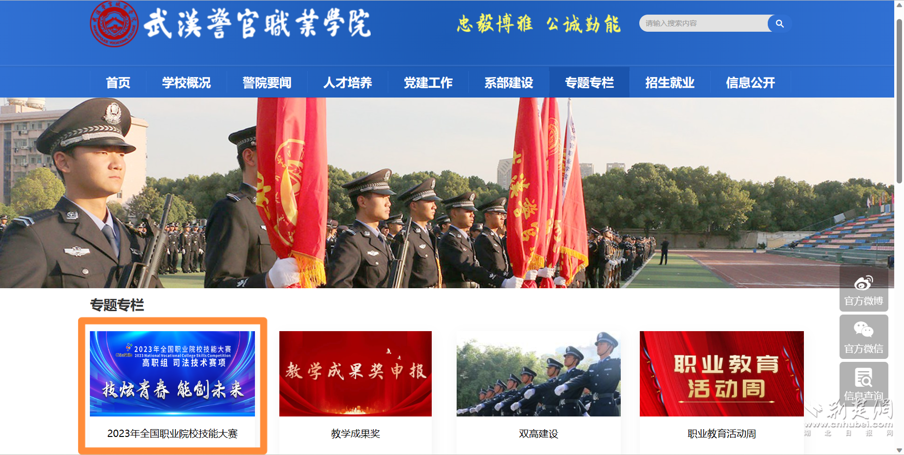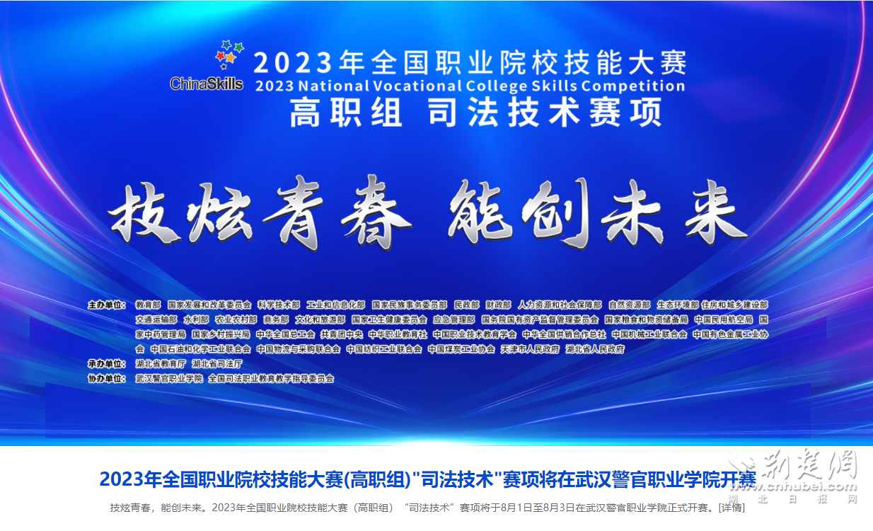 荊楚網(湖北日報網)訊(記者肖慧婷 通訊員郭沁文)技炫青春,能創未來。2023年全國職業院校技能大賽(高職組)“司法技術”賽項將于8月1日至8月3日在武漢警官職業學院正式開賽。7月28日,2023年全國職業院校技能大賽(高職組)“司法技術”賽項專題正式上線,專題在荊楚網法治頻道、武漢警官職業學院官網首頁和學校官微菜單欄處進行展示。