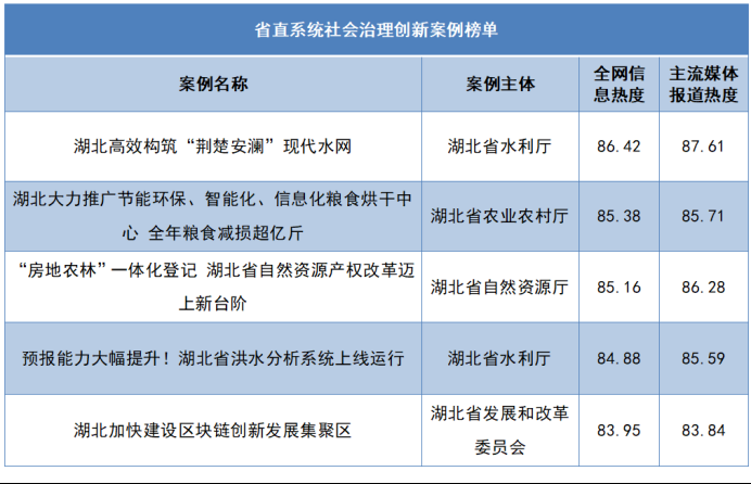 從省直系統社會治理創新案例榜單看,人民日報、新華社、央視網、光明網、中新網、湖北日報、荊楚網、長江網等媒體關注報道湖北省水利廳扎實推進流域綜合治理,高效構筑“荊楚安瀾”現代水網,加快建設引江補漢、鄂北二期、姚家平水利樞紐等多項重大水利工程,牢牢守住水安全底線,實現水的永續利用與經濟社會高質量發展。湖北省農業農村廳、省財政廳、省自然資源廳、省糧食局、省農業發展中心聯動攻關,根據糧食的種植面積、產量,以合作社、家庭農場、種糧大戶、糧食加工企業為主體,本著產地就近就地的原則,大力推廣節能環保、智能化、信息化糧食烘干中心,糧食產地烘干率超過67%,全年可減少糧食因霉變損失1億多斤。