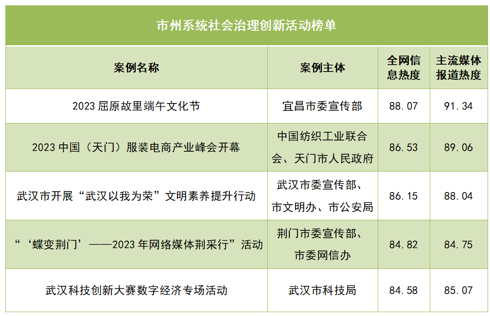 本期市州系統社會治理創新活動榜單中,6月21日,“中國端午 詩意宜昌”2023屈原故里端午文化節開幕,2023國際劃聯龍舟世界杯、第四屆“屈原杯”(全國)詩歌大賽頒獎典禮暨端午詩會等活動輪番上演,全景展現屈原故里獨有的端午習俗。特別的是,2023年央視端午晚會首次走出央視演播廳,全程全景在宜昌拍攝,并在央視綜合頻道、央視綜藝頻道、央視音樂頻道、央視頻同步直播。6月28日,2023中國(天門)服裝電商產業峰會開幕,以“電商新經濟·數字新集群·產業新未來”為主題,邀請業界知名專家學者、企業家代表共襄行業盛典、共謀產業發展、共贏服裝未來,獲得新華網、央廣網、中新網湖北、湖北日報、荊楚網等主流媒體報道。