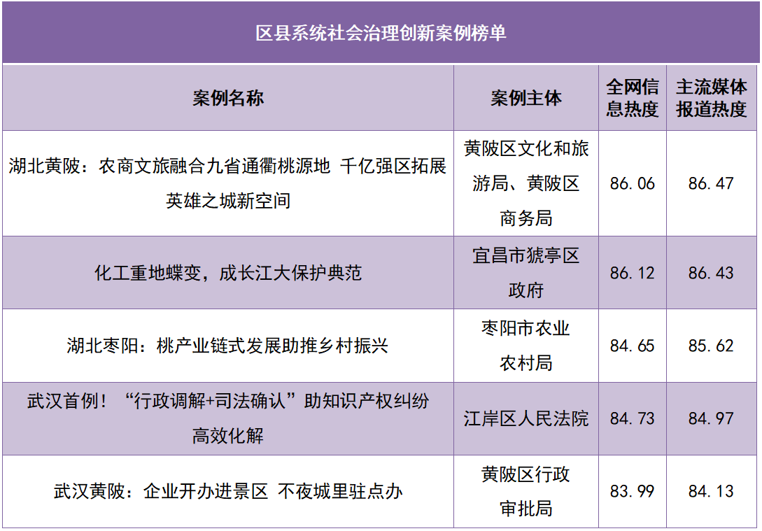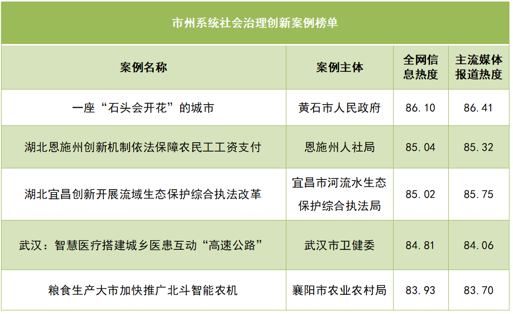從市州系統社會治理創新案例榜單看,中國新聞網、中國網、法治日報、極目新聞等媒體關注報道黃石市政府采取先行試點、逐步推廣、博采眾長,久久為功,引進國內外最新科技成果,綜合運用治理技術,完成了黃荊山、長樂山南北麓78個開山塘口的修復,同時,取締關停長江非法砂石碼頭,重新優化調整露天礦山開發布局,實施產業升級,著力推進綠色轉型;在生態環境改善的同時,鼓勵企業申報創建高新技術企業、綠色工廠和“專精特新”小巨人企業,促進企業向綠色高端邁進。恩施市人社局通過建設領域保障農民工工資支付管理系統,建立一整套農民工工資支付法治保障制度體系;嚴格落實行政執法“三項制度”,不斷加大執法力度,對欠薪案件及時受理,認真調查,快速結案,糾正和打擊損害農民工合法權益的違法行為;通過聯席會議、追責問責、聯合懲戒等三項機制,切實壓實政府屬地責任、職能部門監管責任和建設施工企業主體責任,形成治理欠薪的強大合力。