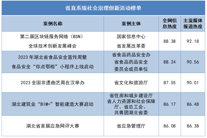 本期省直系統社會治理創新活動榜單中,第二屆區塊鏈服務網絡(BSN)全球技術創新發展峰會在武漢成功舉辦,獲得新華網、國際在線、中國日報網、中國網湖北、湖北日報、極目新聞、長江云等媒體報道。6月20日,2023年湖北省食品安全宣傳周暨食品安全“你點鄂檢”小程序上線啟動儀式在漢舉行,輿論點贊“你點鄂檢”成為市場監管部門與消費者、經營者之間的溝通橋梁和聯絡紐帶,有效推動了食品安全共建共治共享。主場活動全程通過荊楚網APP、斗魚直播雙平臺進行網絡直播,48萬余人次在線觀看。