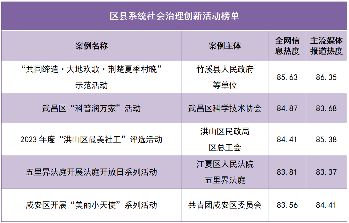 本期區縣系統社會治理創新活動榜單中,國際在線、湖北日報、荊楚網、極目新聞、長江云等媒體聚焦“大地歡歌·荊楚夏季村晚”示范活動暨竹溪縣肖家邊電影小村上線運營啟動,竹溪縣作為2023年全省夏季“村晚”、全國冬季“村晚”示范展示點,立足本地豐富多彩的文旅資源,呈現鄉村振興的豐碩成果,推動文旅深度融合。6月16日,武昌區科協2023年科普服務進社區項目“科普潤萬家”活動在紫陽街道起義門社區首秀獲得廣泛好評,今年預計為全區142個社區提供科普服務,開展350場科普活動,用科學提質百姓生活,讓科普滋潤千家萬戶。