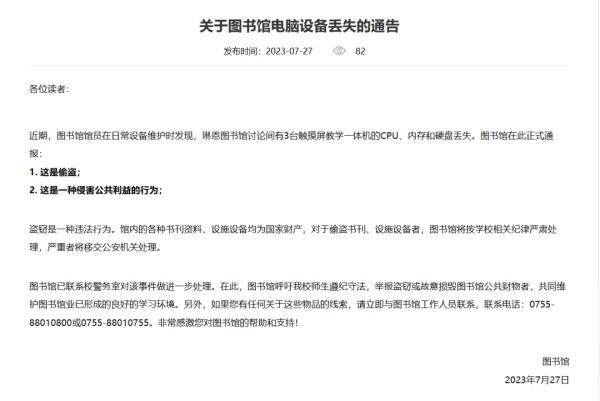 南方科技大學圖書館7月27日向“各位讀者”發布《關于圖書館電腦設備丟失的通告》稱,近期,圖書館館員在日常設備維護時發現,琳恩圖書館討論間有3臺觸摸屏教學一體機的CPU、內存和硬盤丟失。