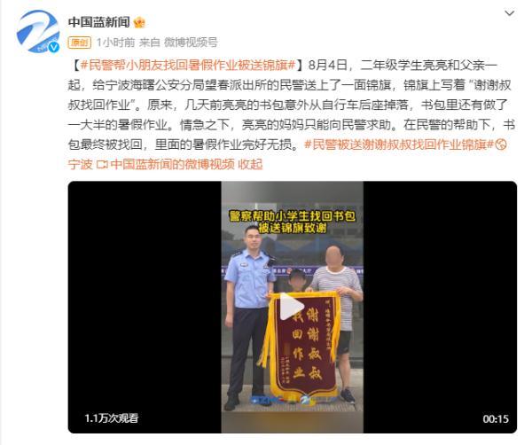 8月4日,二年級學生亮亮和父親一起,給寧波海曙公安分局望春派出所的民警送上了一面錦旗,錦旗上寫著“謝謝叔叔找回作業”。原來,幾天前亮亮的書包意外從自行車后座掉落,書包里還有做了一大半的暑假作業。情急之下,亮亮的媽媽只能向民警求助。在民警的幫助下,書包最終被找回,里面的暑假作業完好無損。