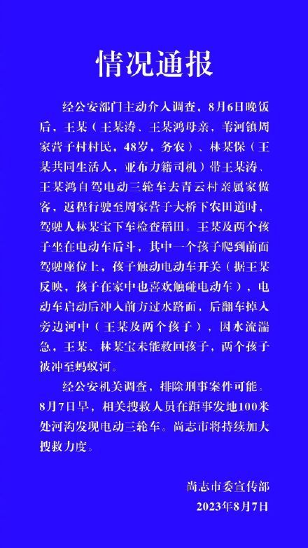 經公安部門主動介入調查,8月6日晚飯后,王某(王某濤、王某鴻母親,葦河鎮周家營子村村民,48歲,務農)、林某保(王某共同生活人,亞布力籍司機)帶王某濤、王某鴻自駕電動三輪車去青云村親屬家做客,返程行駛至周家營子大橋下農田道時,駕駛人林某寶下車檢查稻田。王某及兩個孩子坐在電動車后斗,其中一個孩子爬到前面駕駛座位上,孩子觸動電動車開關(據王某反映,孩子在家中也喜歡觸碰電動車),電動車啟動后沖入前方過水路面,后翻車掉入旁邊河中(王某及兩個孩子),因水流湍急,王某、林某寶未能救回孩子,兩個孩子被沖至螞蟻河。
