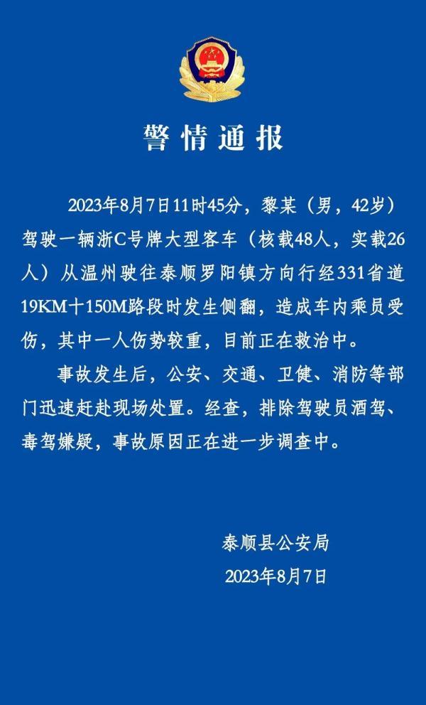 下午5時50分,泰順縣公安局官方公眾號通報稱,2023年8月7日11時45分,黎某(男,42歲)駕駛一輛浙C號牌大型客車(核載48人,實載26人)從溫州駛往泰順羅陽鎮方向行經331省道19KM+150M路段時發生側翻,造成車內乘員受傷,其中一人傷勢較重,目前正在救治中。