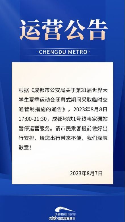 從@成都地鐵獲悉,根據《成都市公安局關于第31屆世界大學生夏季運動會閉幕式期間采取臨時交通管制措施的通告》,2023年8月8日17:00-21:30,成都地鐵1號線韋家碾站暫停運營服務,請市民乘客提前做好出行安排。