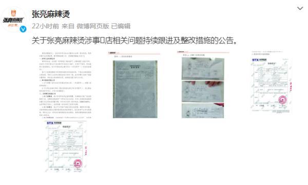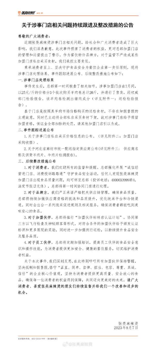 8月7日,張亮麻辣燙官微通報一加盟店羊肉被檢出是豬鴨肉一事進展。