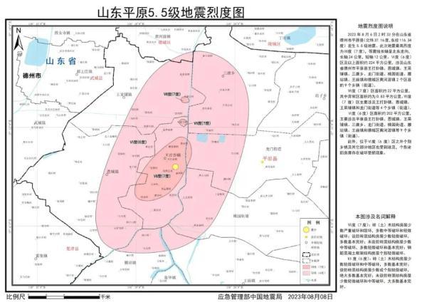 Ⅵ度(6度)區面積約202平方公里,主要涉及平原縣王打卦鎮、恩城鎮、王杲鋪鎮、三唐鄉、龍門街道、桃園街道、腰站鎮、王廟鎮和德城區黃河涯鎮等9個鄉鎮(街道)。