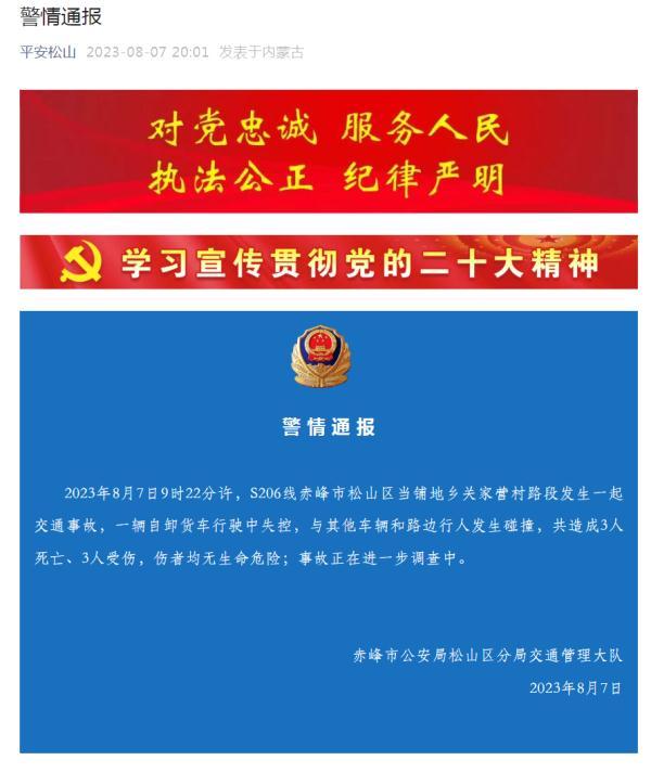 據“平安松山”微信公眾號消息:2023年8月7日9時22分許,S206線赤峰市松山區當鋪地鄉關家營村路段發生一起交通事故,一輛自卸貨車行駛中失控,與其他車輛和路邊行人發生碰撞,共造成3人死亡、3人受傷,傷者均無生命危險;事故正在進一步調查中。