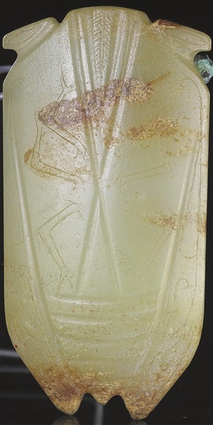 蟬是漢代玉器比較常見的一種題材。天博館藏西漢玉蟬,淡青色,質(zhì)地細(xì)密光潤。蟬形為扁平狀,中間稍厚。頭部的雙目外凸成方棱形,正面刻出雙翅,尾和翅端呈三角形狀,腹部刻出足紋。線條堅挺利落,細(xì)弱發(fā)絲,形象逼真,結(jié)構(gòu)準(zhǔn)確。此蟬無鉆孔,當(dāng)做專用的玉琀。