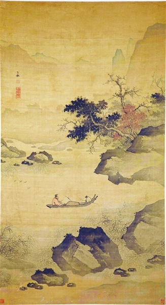 天博館藏明代蔣嵩的《秋江歸棹圖》軸,畫中遠(yuǎn)山如黛,江面微微泛波,一葉小舟悠然浮在水面。船夫回頭張望,船尾一老者閑適地看書,任憑小舟在水中飄蕩。岸上有山石樹木,水邊有蘆葦叢叢,一派秋季的醉人風(fēng)光。天博書畫研究部的李晶介紹:“畫面層次感很強,布局優(yōu)美,遠(yuǎn)山近水、山石、樹木、蘆葦搭配得相得益彰。內(nèi)容豐富,意境簡淡,水墨厚重。山石兼皴帶染,筆墨滋潤。”