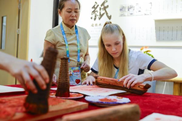 8月3日,在成都大運(yùn)村的互動(dòng)體驗(yàn)中心,芬蘭運(yùn)動(dòng)員杰茜卡·卡哈拉在非遺項(xiàng)目夾江年畫代表性傳承人陳曉容(左)的指導(dǎo)下制作年畫。新華社記者沈伯韓攝