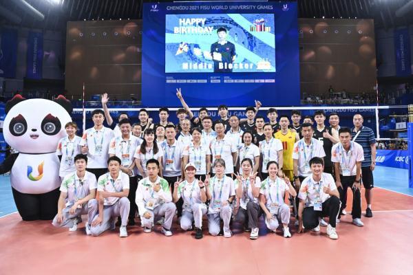 8月7日,排球場館的志愿者在成都大運(yùn)會(huì)男子排球銅牌賽后與中國隊(duì)球員合影。新華社記者曹祎銘攝