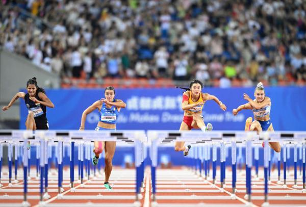 8月4日,中國選手吳艷妮(右二)在成都大運(yùn)會(huì)女子100米欄決賽中。新華社記者鄧華攝