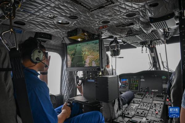 8月8日,天津市公安局警務航空總隊任務員在空中用光電吊艙對地面區域進行觀測。