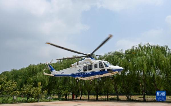 8月8日,在天津市靜海區臺頭鎮,天津市公安局警務航空總隊直升機起飛準備執行任務。