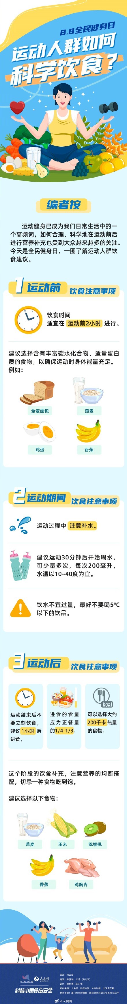 今天是第15個(gè)全民健身日,你堅(jiān)持運(yùn)動(dòng)了嗎?運(yùn)動(dòng)的不同階段,飲食皆有所側(cè)重。①運(yùn)動(dòng)前2小時(shí)適合進(jìn)食;②運(yùn)動(dòng)期間注意補(bǔ)水;③運(yùn)動(dòng)后講究營養(yǎng)均衡搭配。一起“動(dòng)”出好身材,“吃”出好身體!