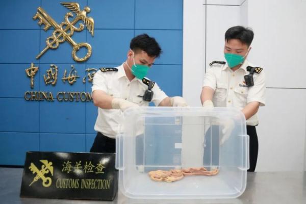 近日,南寧海關所屬東興海關在一名入境旅客行李物品中查獲4條活體寵物蛇,經鑒定為網紋蟒,為近年來廣西口岸旅檢入境渠道首次查獲活體蛇類。目前已移交至自然資源局進一步處理。