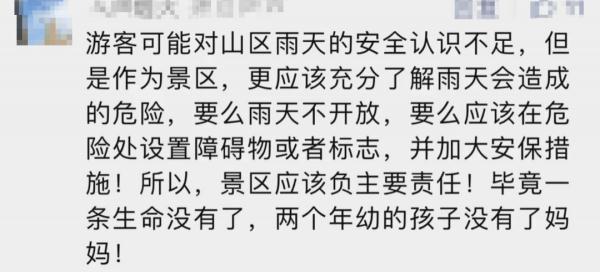 徐先生說,妻子走后,留下兩個(gè)未成年兒子,一個(gè)6歲,一個(gè)才3歲,夫妻倆家中還有4名老人要贍養(yǎng)。“我們認(rèn)為責(zé)任全部在景區(qū),事發(fā)現(xiàn)場(chǎng)是一個(gè)陡的崖坡,根本沒有護(hù)欄,那個(gè)地方相當(dāng)危險(xiǎn)。”徐先生質(zhì)疑,當(dāng)天明明在下雨,景區(qū)為何不采取封閉措施,還放任游客前去游玩。