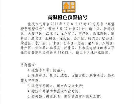 8月8日12時00分,重慶連續第三天發布“高溫橙色預警信號”。預計8日12時至20時,渝中區、沙坪壩區、大渡口區、江北區、九龍坡區、南岸區、兩江新區、高新區、渝北區、北碚區、潼南區、合川區、銅梁區、璧山區、榮昌區、永川區、江津區、長壽區、忠縣、梁平區、萬州區、開州區、云陽縣、奉節縣、武隆區、彭水縣海拔400米以下地區日最高氣溫將升至37°C以上。請以上各地注意防范。(上游新聞記者石亨)
