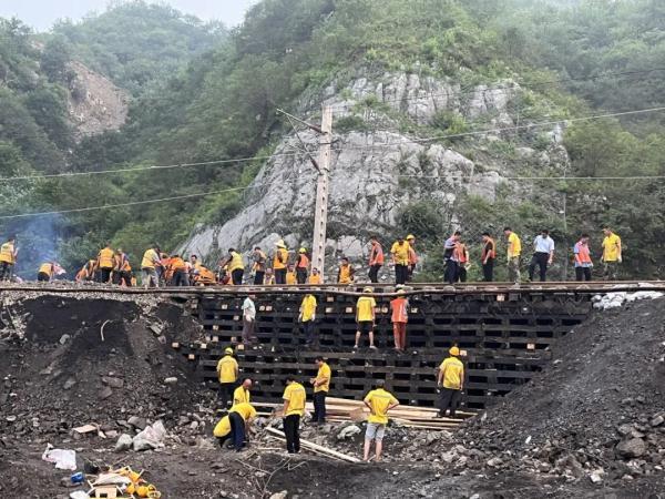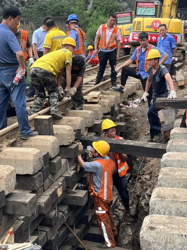 據該段施工四隊班組長王樹直介紹,他們原本在唐山附近進行戶外施工作業,接到搶險任務后,立即從唐山趕到這里,清理碎石泥沙,搭枕木垛,為線路鋪通打好“地基”。