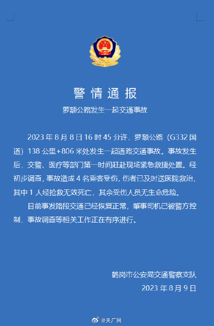 經(jīng)初步調(diào)查。事故造成4名乘客受傷,傷者已及時送醫(yī)院救治,其中1人經(jīng)搶救無效死亡,其余受傷人員無生命危險。