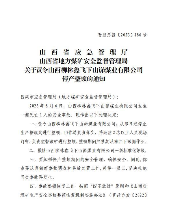 通知顯示,8月6日,山西柳林鑫飛下山峁煤業有限公司發生一起死亡1人的安全事故,責令山西柳林鑫飛下山峁煤業有限公司,從即日起停止生產按規定進行整頓。由你局負責落實,并派駐2名以上人員現場盯守,負責監督該礦進行整頓,整頓期間嚴禁其從事井下采掘作業。