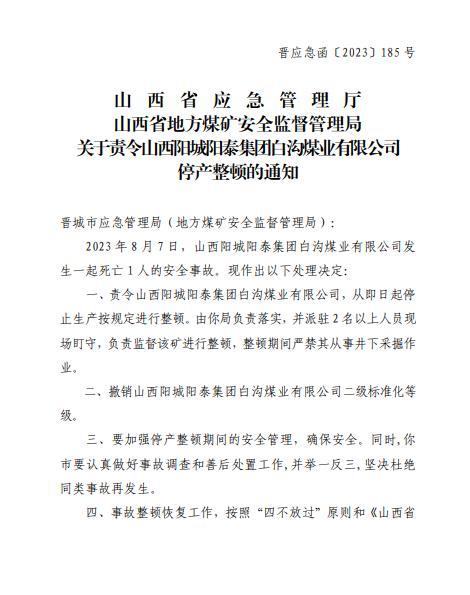 同時撤銷山西陽城陽泰集團白溝煤業有限公司二級標準化等級。