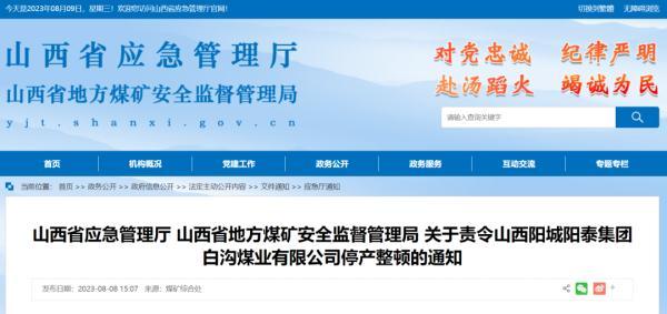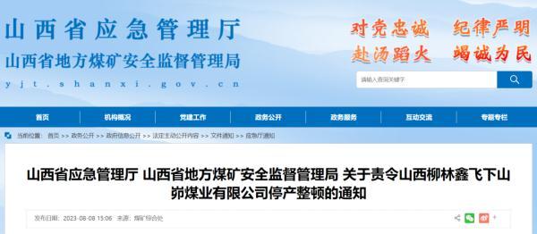 山西省應急管理廳官網8月8日發布兩則通知,責令山西柳林鑫飛下山峁煤業有限公司、山西陽城陽泰集團白溝煤業有限公司停產整頓。