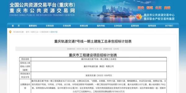 根據《招標計劃表》,重慶軌道交通7號線一期土建施工總承包分為4個工程包進行公開招標。