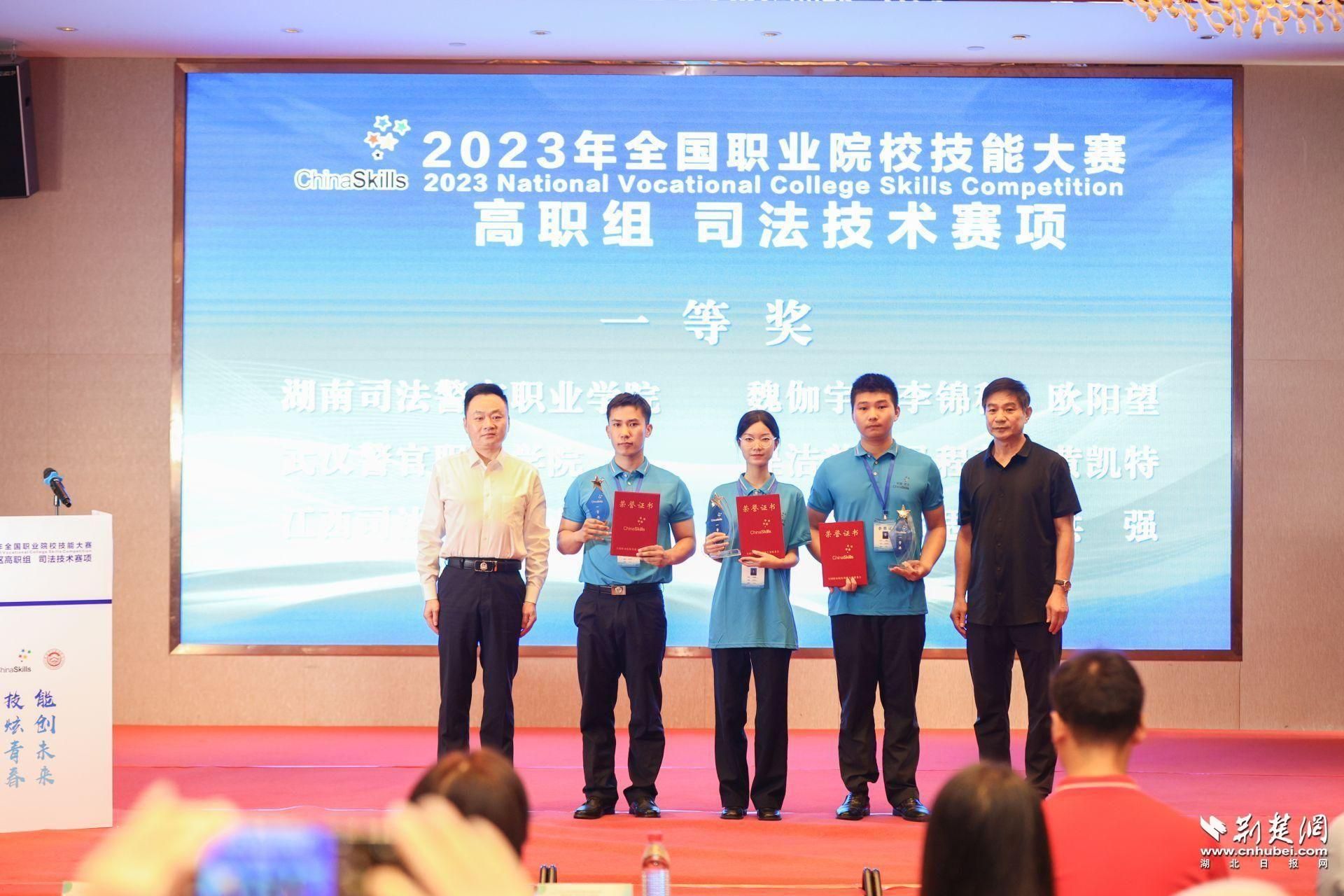 全國司法行業職業教育教學指導委員會副主任于連濤,武漢警官職業學院黨委書記、校長陳風華為一等獎隊伍頒獎。劉峰 攝