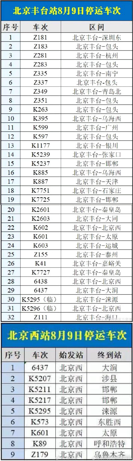 受水害影響,今天(9日)北京西站、北京豐臺站部分列車停運,已購買停運列車車票的旅客,可于30日內(nèi)辦理全額退票手續(xù)。請廣大旅客合理安排出行,關(guān)注鐵路部門公告。(北京西站、北京豐臺站)