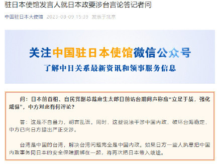 問:日本前首相、自民黨副總裁麻生太郎日前訪臺期間聲稱應“立足于戰,強化威懾”,中方對此有何評論?