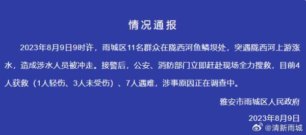 2023年8月9日9時許,雨城區11名群眾在隴西河魚鱗壩處,突遇隴西河上游漲水,造成涉水人員被沖走。接警后,公安、消防部門立即趕赴現場全力搜救,目前4人獲救(1人輕傷、3人未受傷)、7人遇難,涉事原因正在調查中。