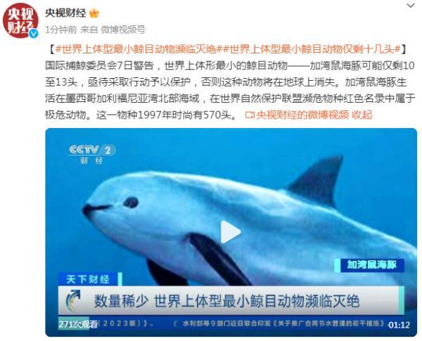 國際捕鯨委員會7日警告,世界上體形最小的鯨目動物——加灣鼠海豚可能僅剩10至13頭,亟待采取行動予以保護,否則這種動物將在地球上消失。加灣鼠海豚生活在墨西哥加利福尼亞灣北部海域,在世界自然保護聯盟瀕危物種紅色名錄中屬于極危動物。這一物種1997年時尚有570頭。